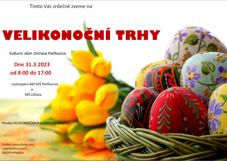 Hračkovnictví v Petřkovicích ve spolupráci s ÚMOb Petřkovice pořádá v pátek 31.3. 2023 v sále Kulturního domu v Ostravě-Petřkovicích tradiční VELIKONOČNÍ TRHY.