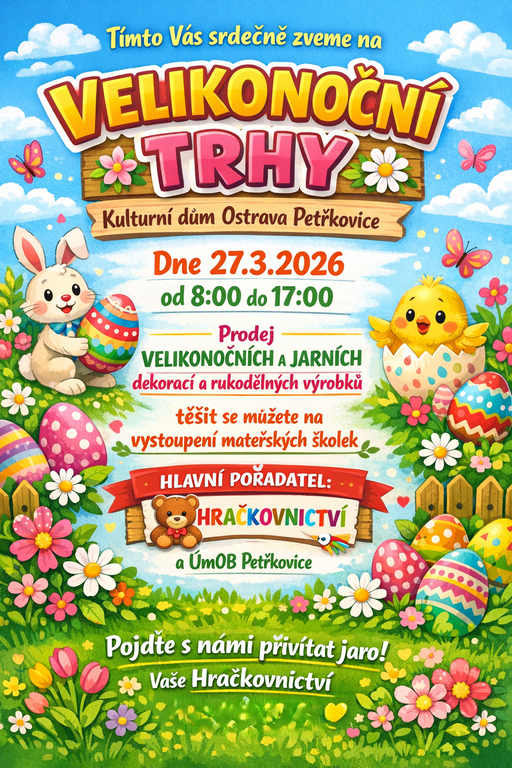 Hračkovnictví v Petřkovicích ve spolupráci s ÚMOb Petřkovice pořádá v pátek 27.3. 2026 v sále Kulturního domu v Ostravě-Petřkovicích tradiční VELIKONOČNÍ TRHY.