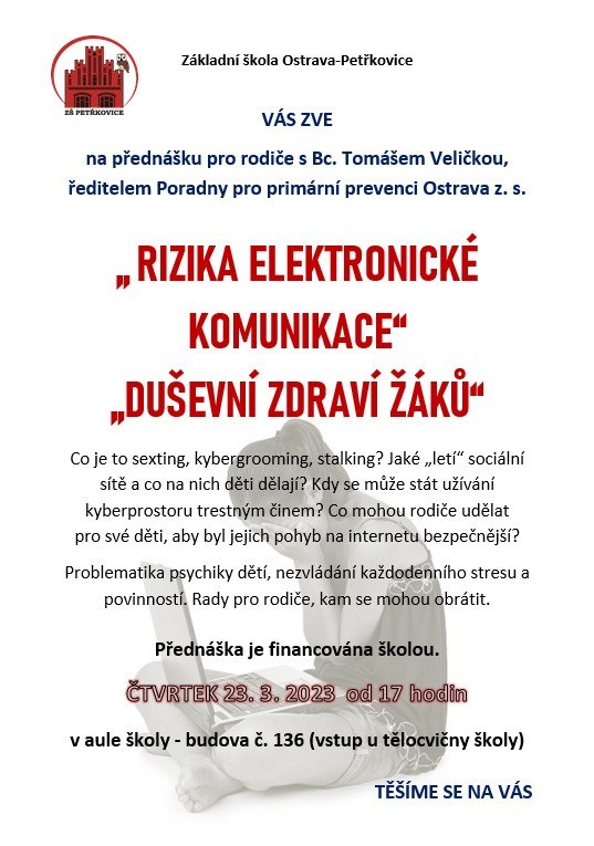 Základní škola v Ostravě - Petřkovicích zve na přednášku "Rizika elektronické komunikace" a "Duševní zdraví žáků", která se koná ve čtvrtek 23.3. 2023 v aule základní školy.